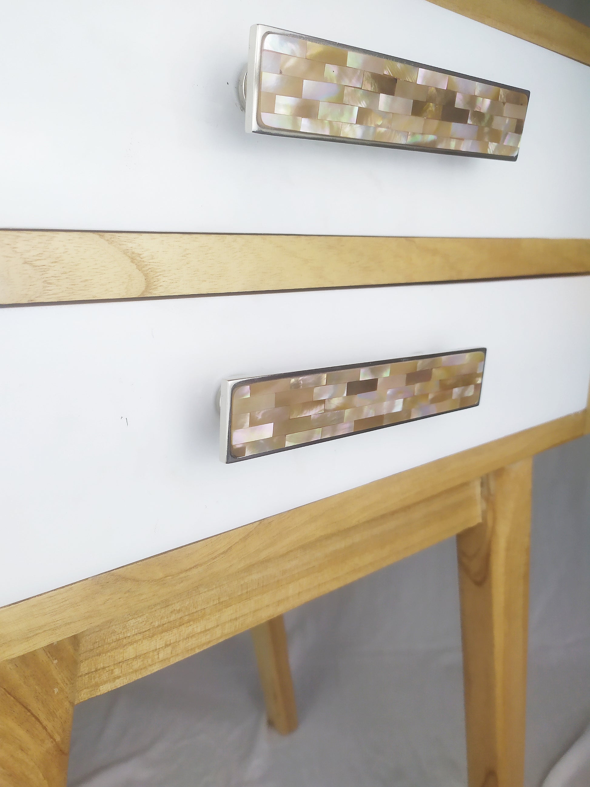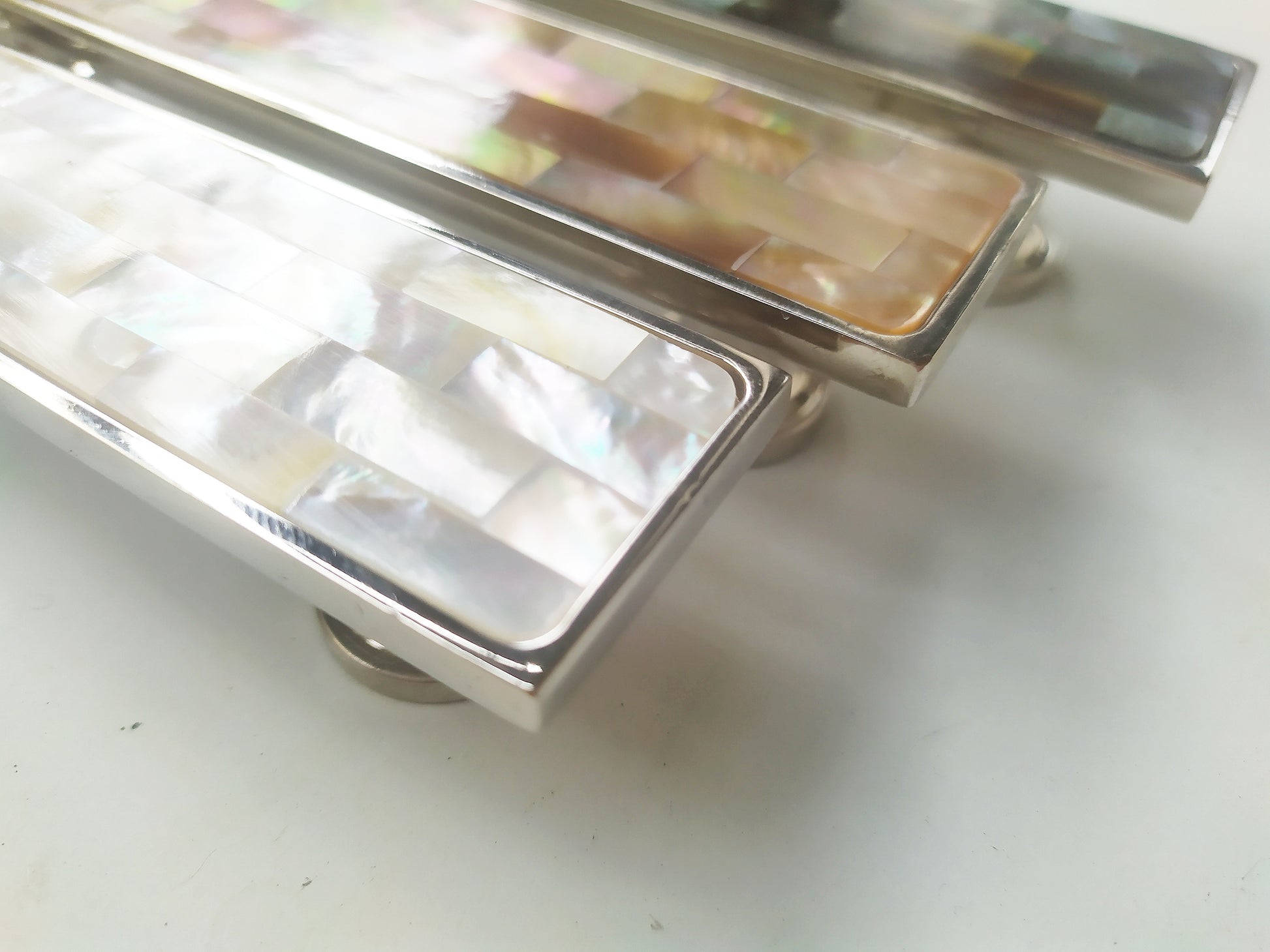 Unique handmade mosaic mother of pearl pull in metal bar for your cabinets.